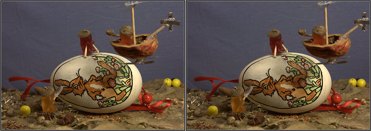 Das ist gar nicht so einfach. Meine Augen weigern sich regelmäßig, die Blickrichtungen parallel zu lassen. Unwillkürlich fokussieren sie auf einen Punkt des Stereobildes, die parallele Blickrichtung der Augen geht verloren und der schöne Stereo-Effekt ist beim Teufel. Ich bin zu doof für diese Methode des Parallelblick-Stereo-Bildes.