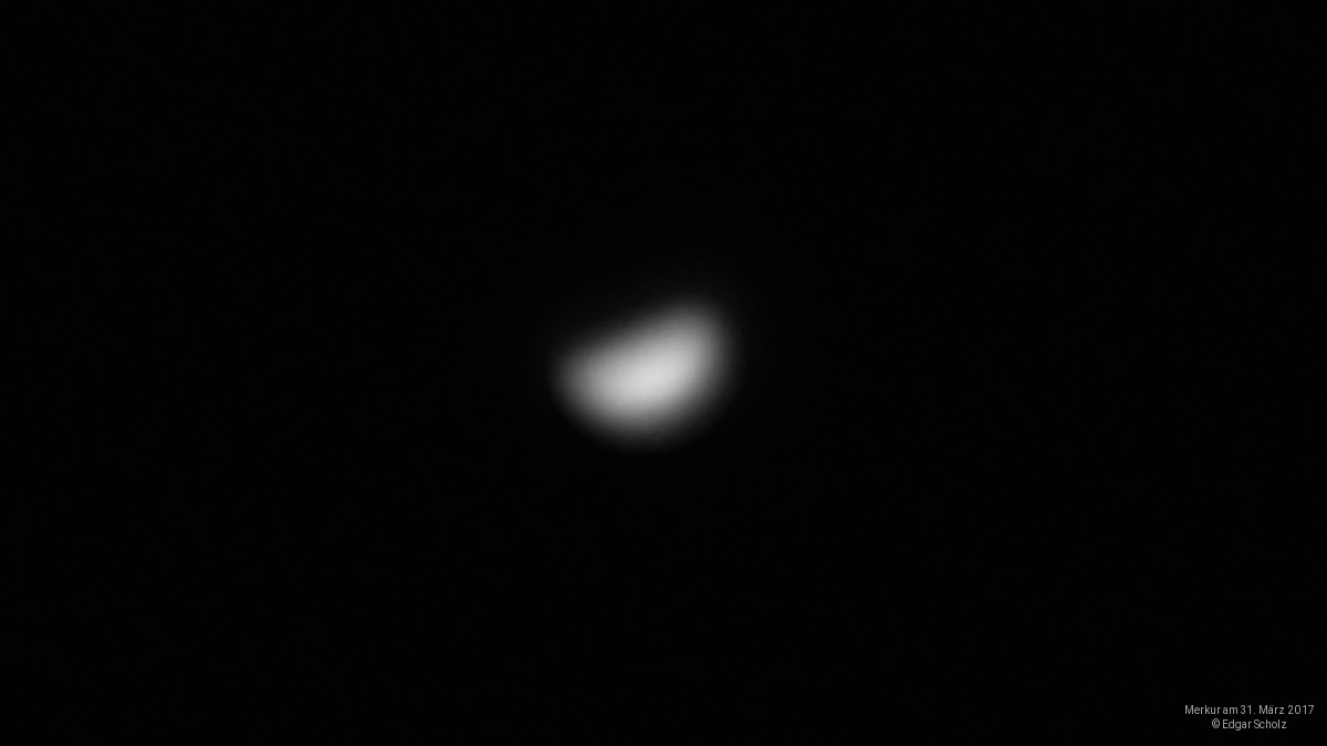 Mein Ziel war es, die Phasengestalt des Merkur sichtbar zu machen, der zum Aufnahmezeitpunkt zu etwa 44% erleuchtet war. Das ist mir gelungen. Deswegen bin ich mit dem Ergebnis der Aufnahmesession sehr zufrieden. Das Bild ist übrigens um den Faktor 3 vergrößert (3fach Drizzle in autostackert).