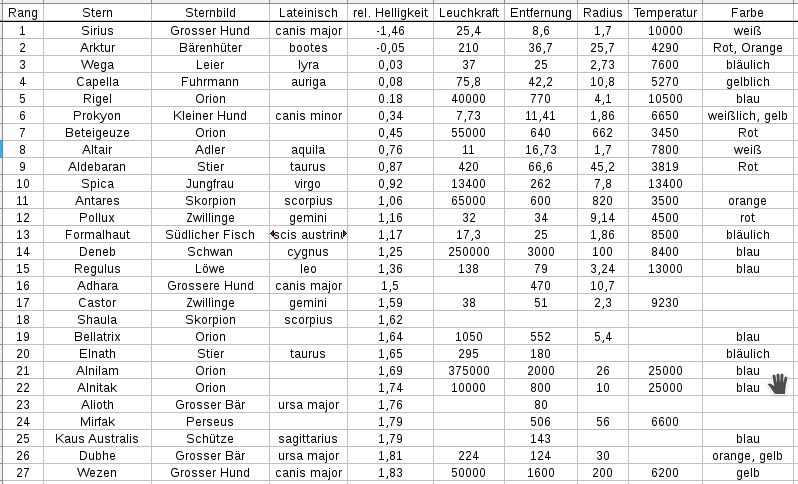 Ich hab eine kleine Liste zusammengestellt, in der die hellsten von uns im Deutschland sichtbaren Sterne mit einigen wichtigen Eigenschaften aufgeführt sind.