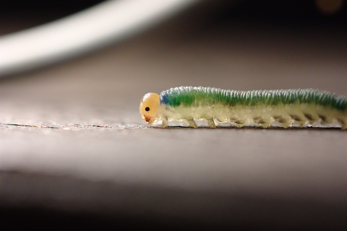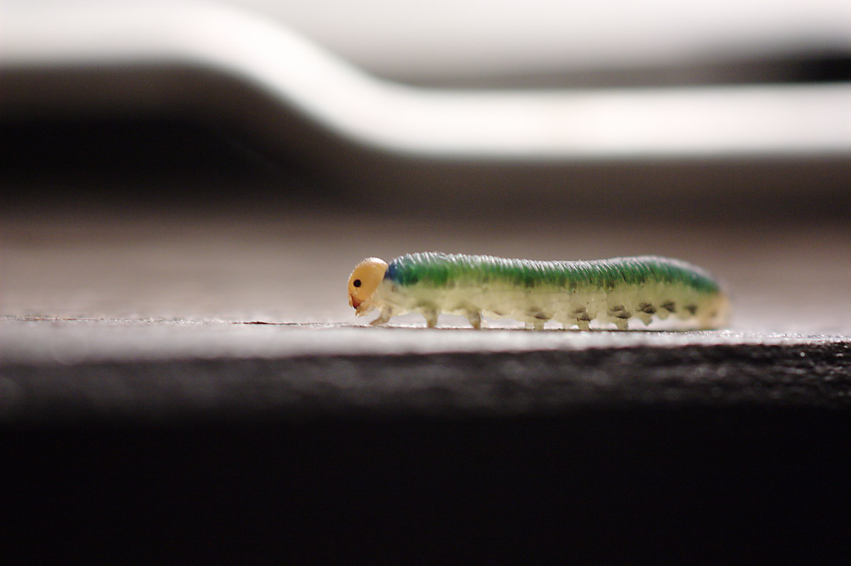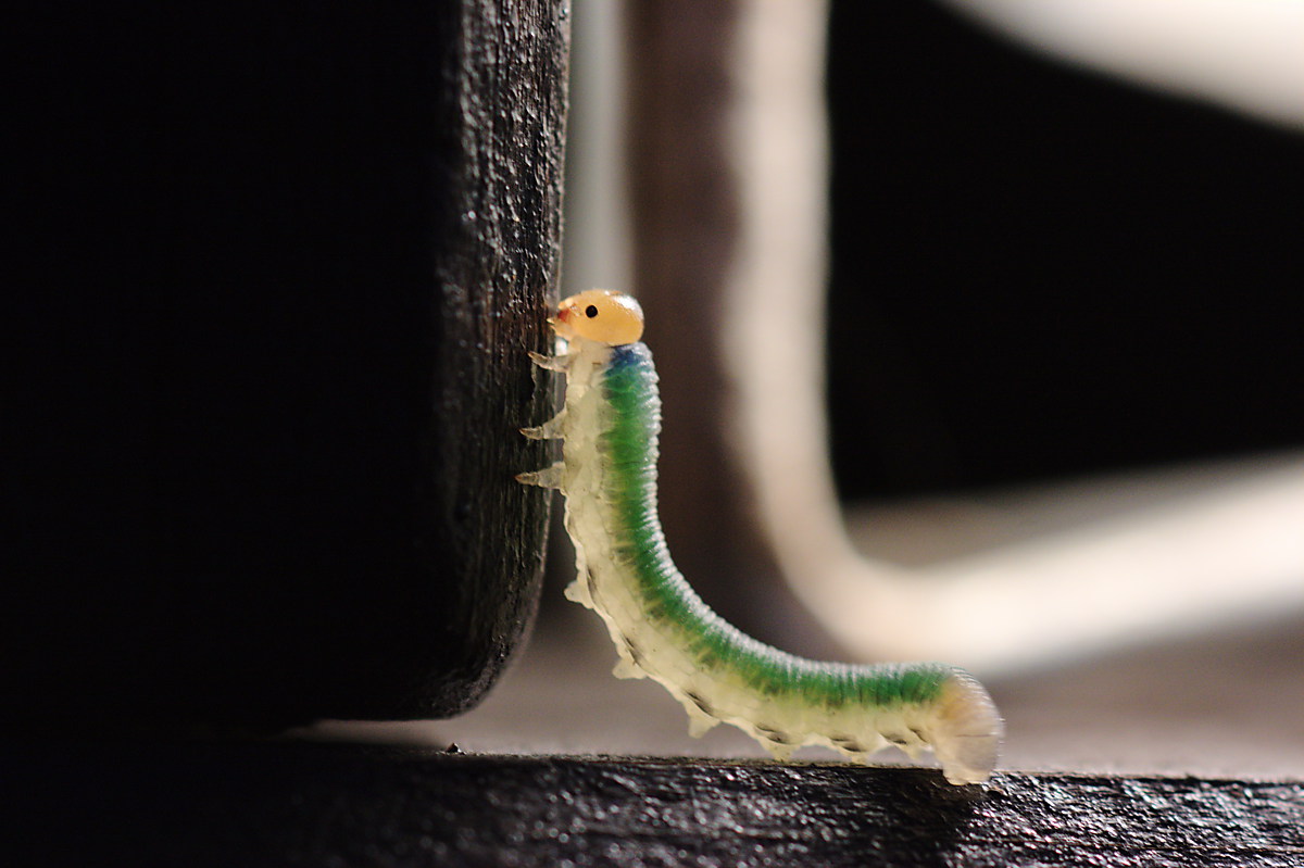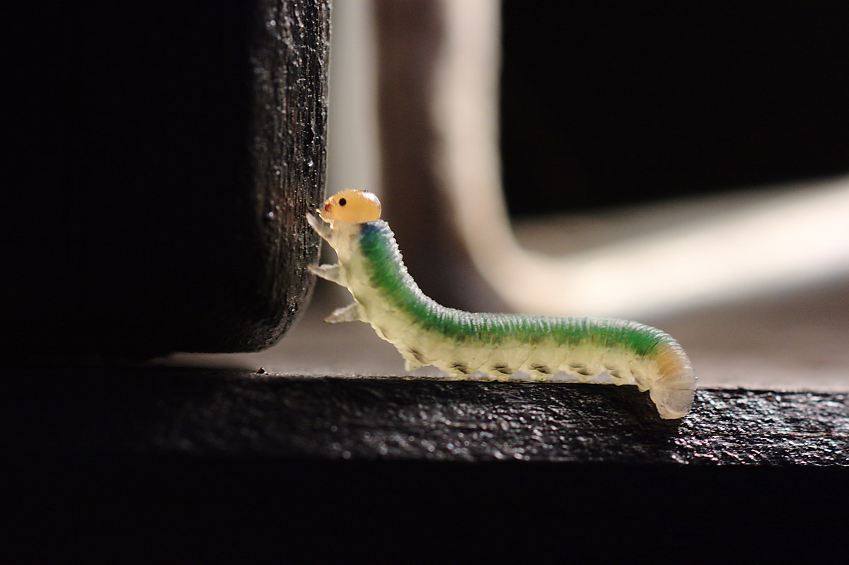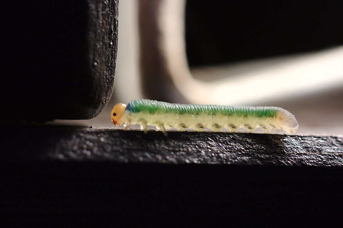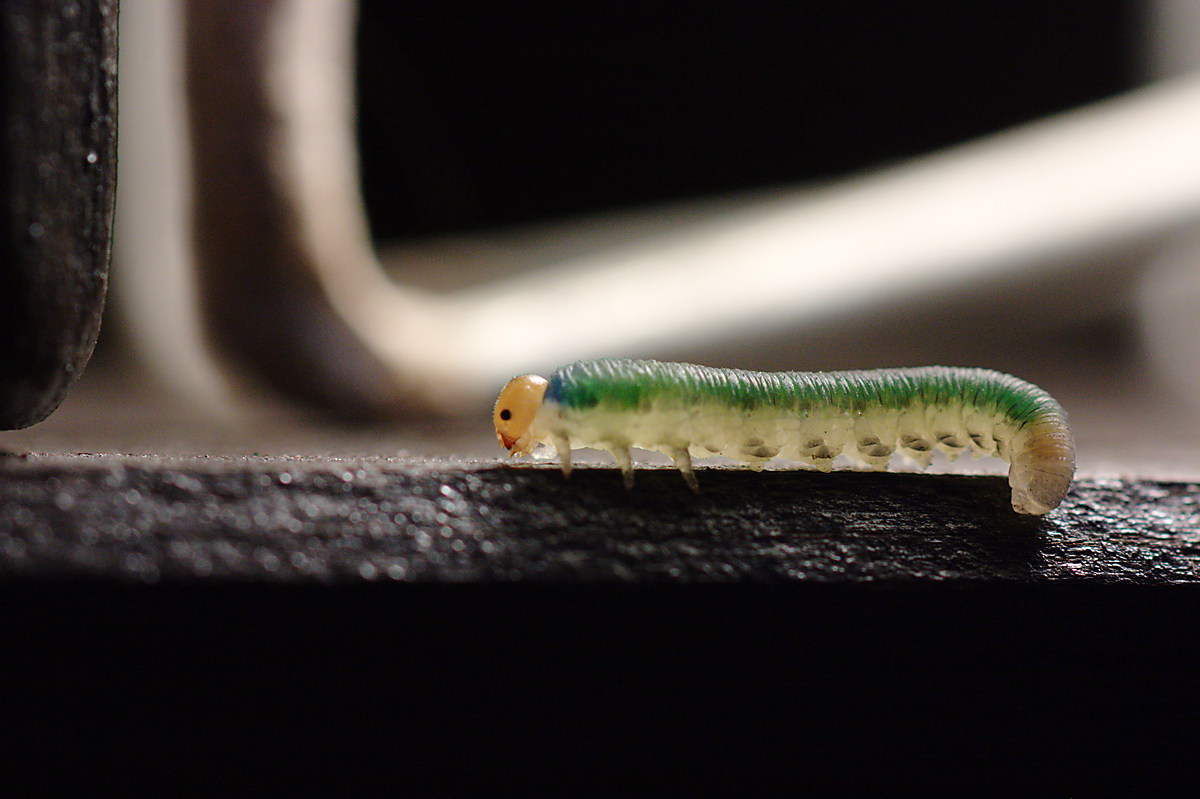 Diese Serie habe ich am Abend vor der anderen Serie fotografiert. Aus dramaturgischen Gründen zeige ich sie aber als Fortsetzung der ersten. Location war ein Balken oben am Haustürvordach. Das waren interessante Aufnahmen, so auf einer wackeligen Staffelei und einem Bierkasten balancierend, die kleine grüne Raupe in zweieinhalb Metern Höhe ins Visier nehmend . Den Inhalt des Bierkastens hatte ich vorher übrigens ordnungsgemäß eingelitert .