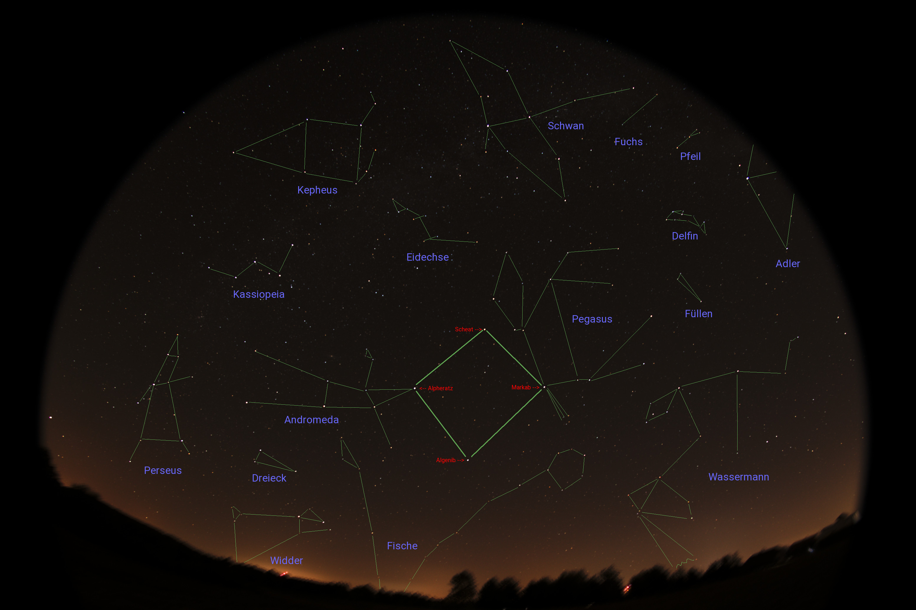 Das Herbstviereck wird vom Flügel unseres geflügelten Pferdes Pegasus gebildet. Annähernd quadratisch ist es eine auffällige Sternenkonstellation.