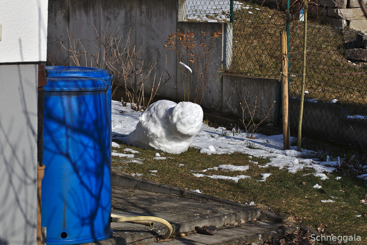 Das nächtliche Brummen war vom Hauseck gekommen. Ich schaltete die Kamera ein. Im Hintergrund war das Schnee-Schneggala (man verzeihe mir meinen mittelfränkischen Dialekt) zu sehen, das schon gewisse Alterserscheinungen zeigte.
