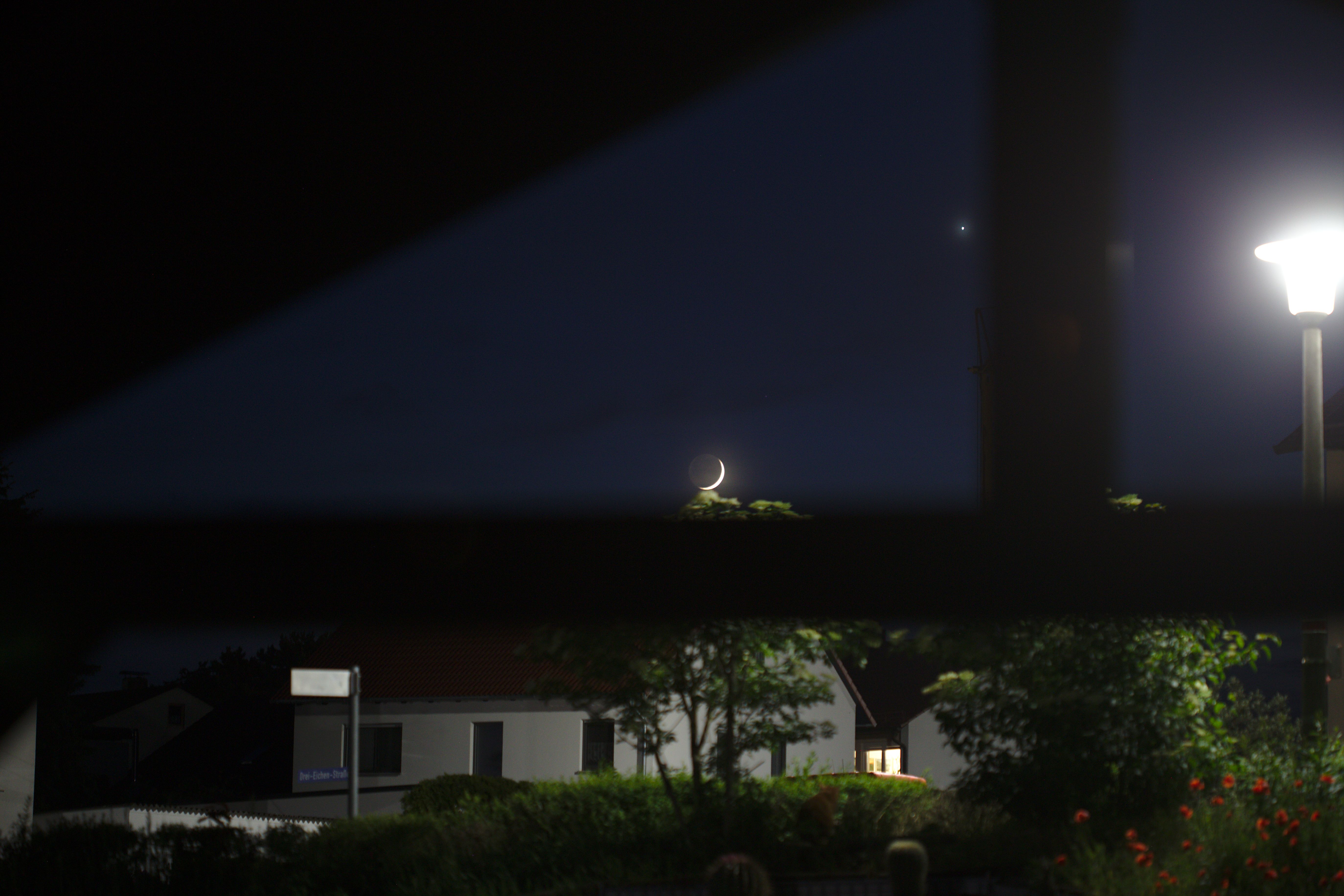 Die kleine Sichel des zunehmenden Mondes, der von der Venus begleitet wird. Schön ist zu sehen, wie das Erdlicht die eigentlich dunkle Seite des Mondes erhellt. Fotografiert hab ich das Ganze durch das Vordach vom Hauseingang mit dem 100er Makro an der Canon 6D.