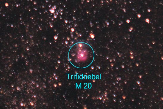 Auf meinem Bild sieht man oberhalb vom Lagunennebel einen weiteren rötlichen Fleck. Das ist M 20, der Trifidnebel