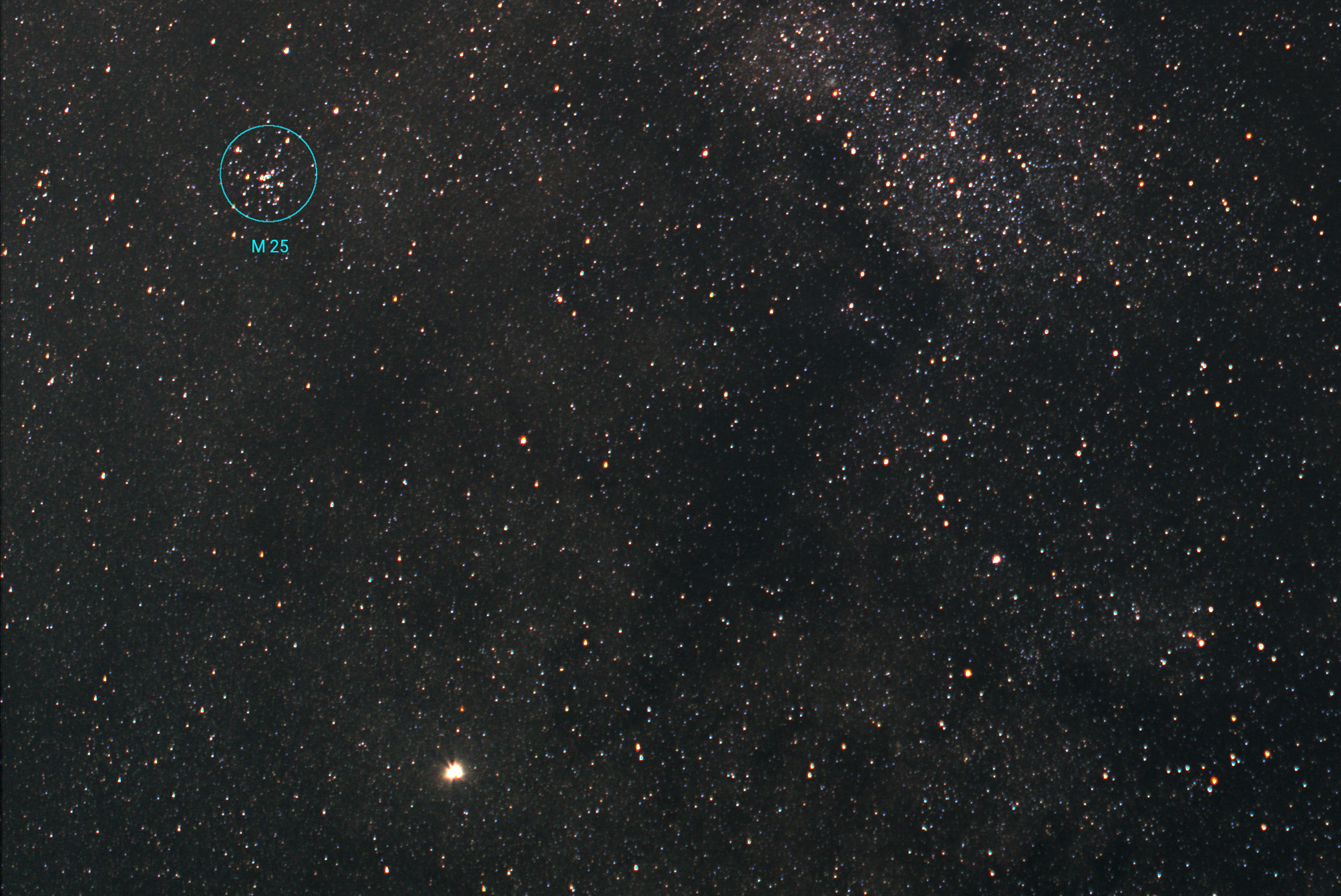 Das Bild enthält zwei Messier-Objekte, die ich genauer betrachten will. Ich beginne mit dem 25. Objekt aus dem Katalog von Charles Messier. Dieses Objekt trägt sinnigerweise den Namen Messier 25 oder kurz M 25: