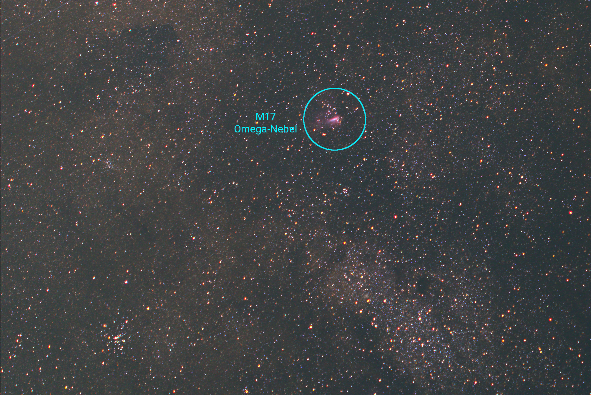 Unser Objekt der Begierde ist diesmal Messier 17, allgemein als Omega-Nebel, seltener als Schwan-Nebel bezeichnet.