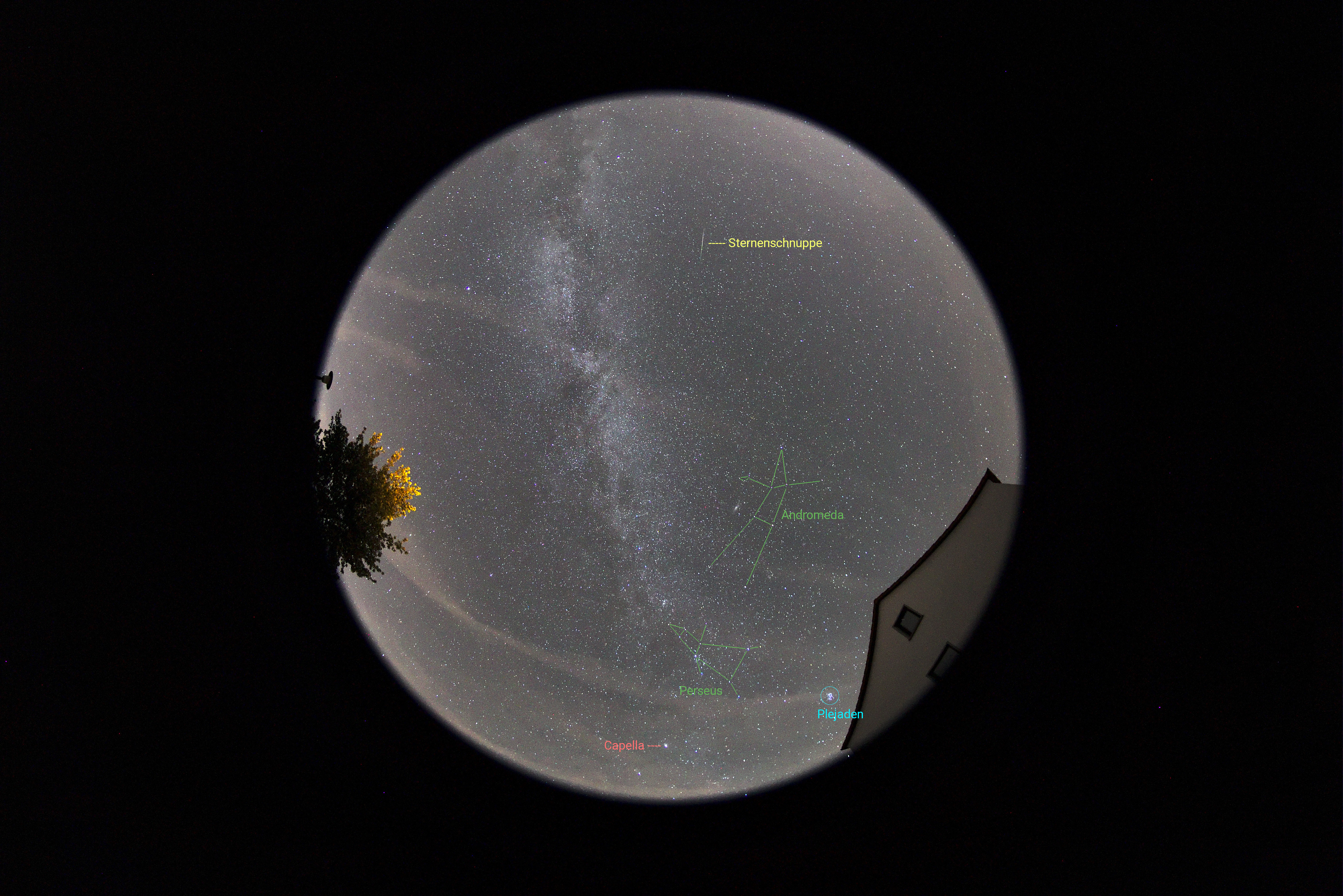 Ich ging kurz nach 1 Uhr raus ins Freie. Ich hatte die Terassentür noch nicht vollständig geschlossen, da wurde ich schon von einer Sternschnuppe aus dem Perseidenstrom freundlich begrüßt. Es war ein sehr helles Exemplar ihrer Gattung und es sollte die Hellste bleiben in den nächsten zweieinhalb Stunden.