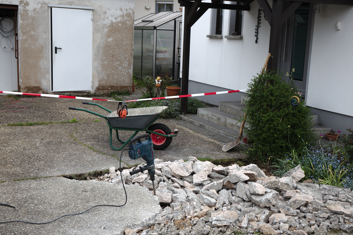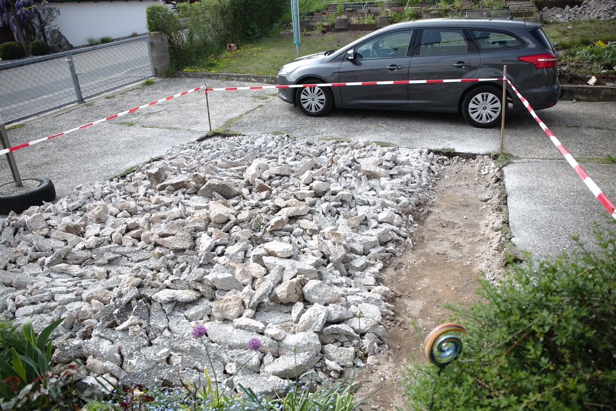 Obwohl, Spatenstich ist vielleicht der falsche Ausdruck. Denn es kam primär mein großer Boschhammer zum Einsatz, um die Waschbetonplatte in handliche Stücke zu zerkleinern. Diese Betonstücke kommen übrigens bei der Neugestaltung meines Kakteenhügels wieder zum Einsatz, der zu klein geworden ist (bzw. die Kakteensammlung wurde größer und größer und größer … )