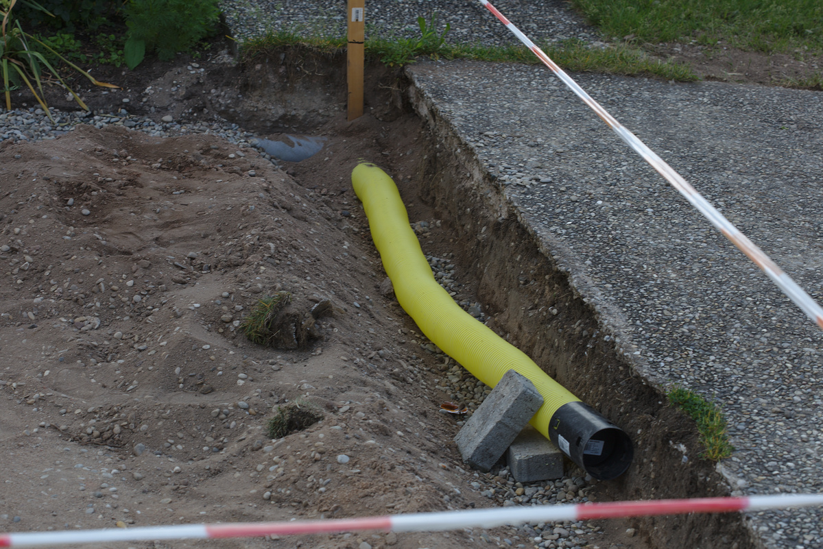 Mehr unvorhergesehene Arbeit: Einbau einer Drainage, die das Wasser in den tieferliegenden Teil des Gartens ableitet.