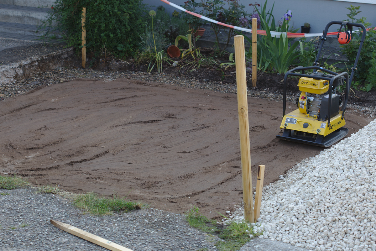 und verdichtete vorsorglich den Untergrund, bevor es an das Ausgraben des Lochs für das Fundament der Betonsäule gehen würde