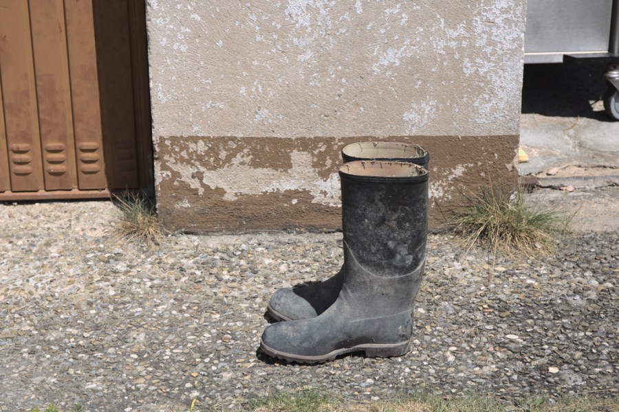 Die Gummistiefel, die ich beim Betonieren an hatte, werden nun nicht mehr gebraucht. Einsam stehen sie in der Gegend rum und warten darauf, aufgeräumt zu werden.