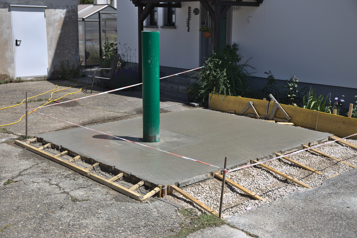 Es ist vollbracht. Heute früh um Halbacht war der Betonmischer da und hat seine Ladung abgeladen.