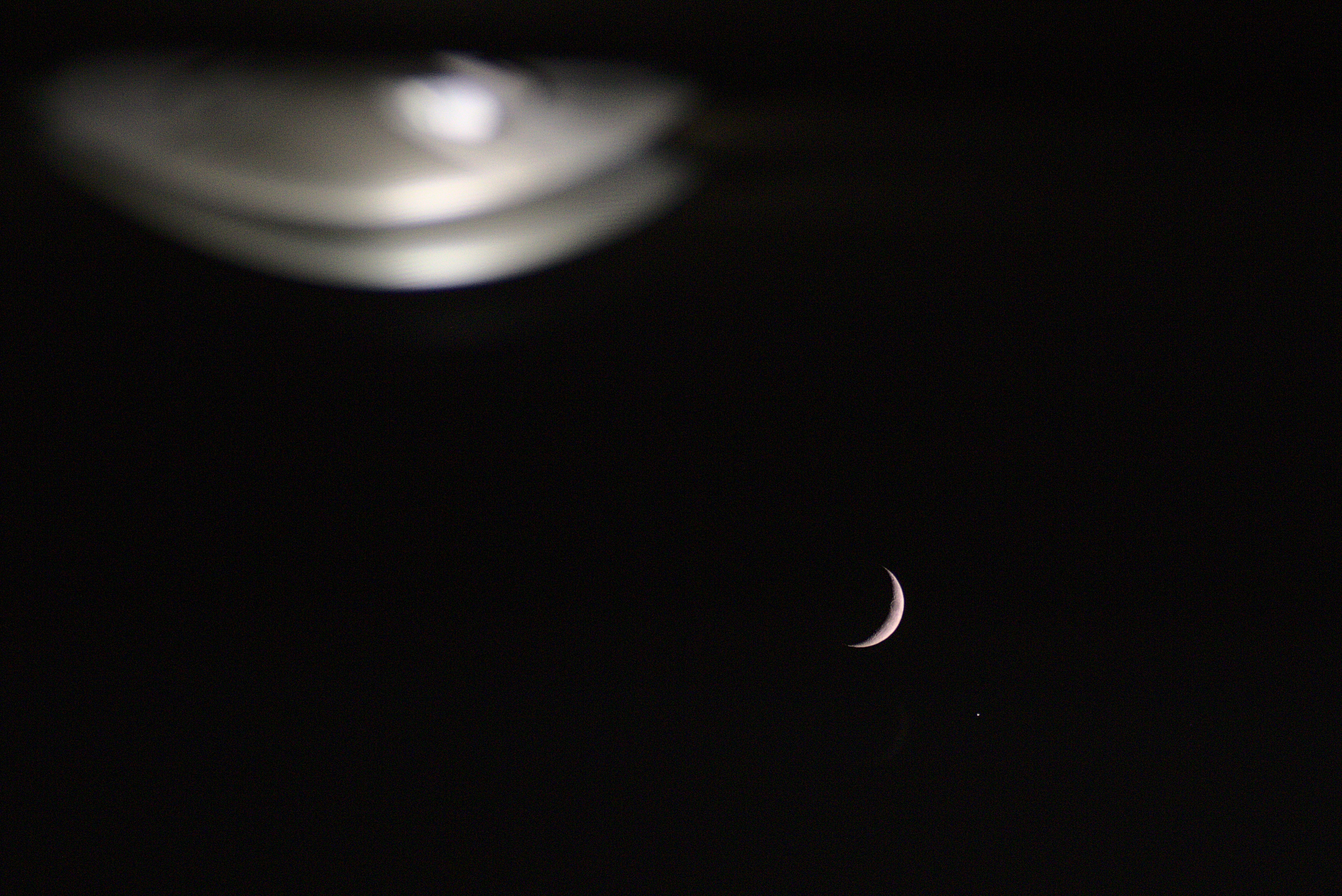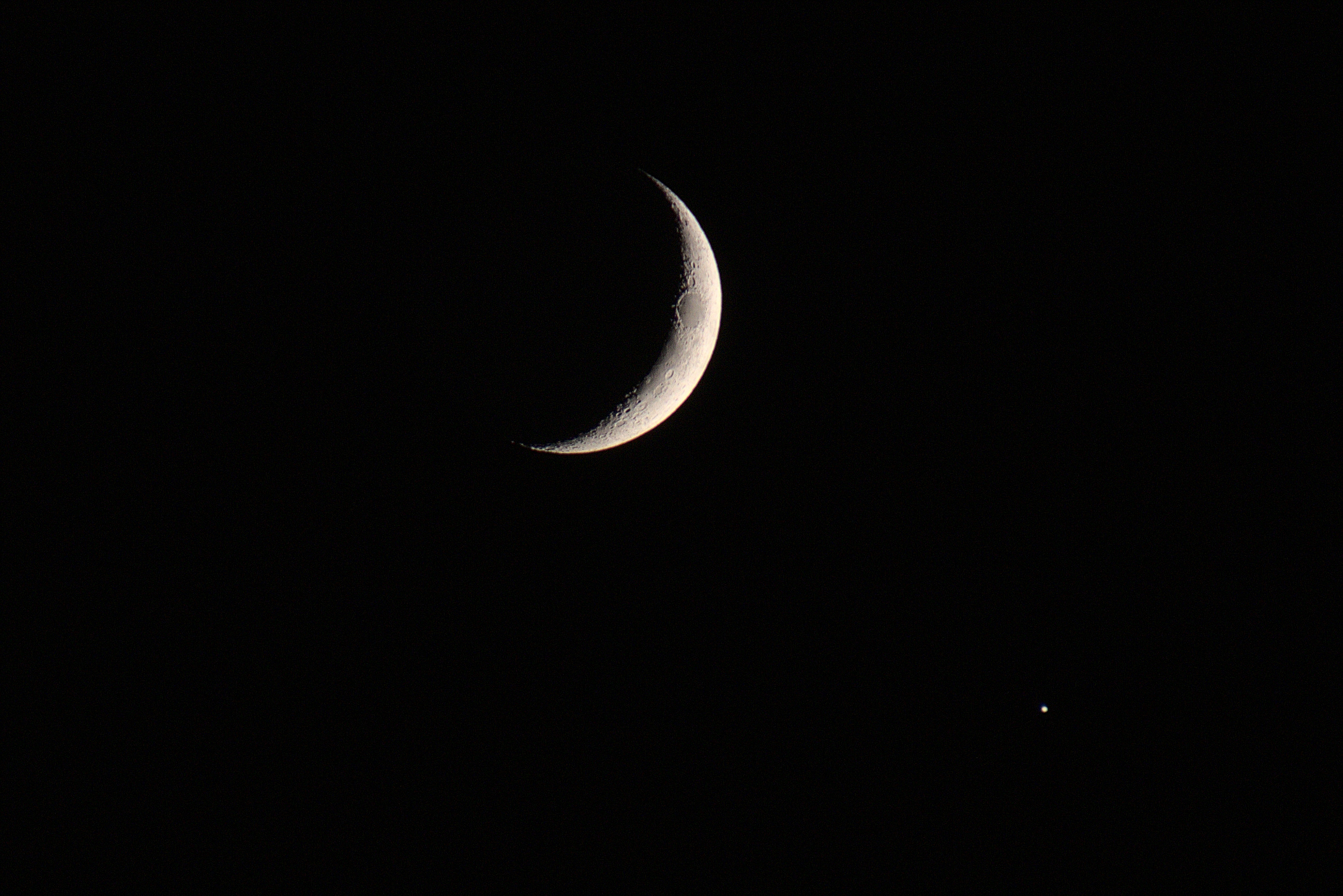 Als ich heute Abend aus dem Fenster schaute, blickte mich eine schöne Mondsichel an. Nicht weit weg davon leuchtet ein heller Stern, der gar kein Stern war. Es war Jupiter, der größte Planet unseres Sonnensystems. Es war ein klasse Anblick und ich griff nach der Kamera, die auf dem Schreibtisch lag. Geschwind das Teleobjektiv draufgeschraubt und freihändig mit kleiner Brennweite ein Foto aus dem Fenster geschossen: