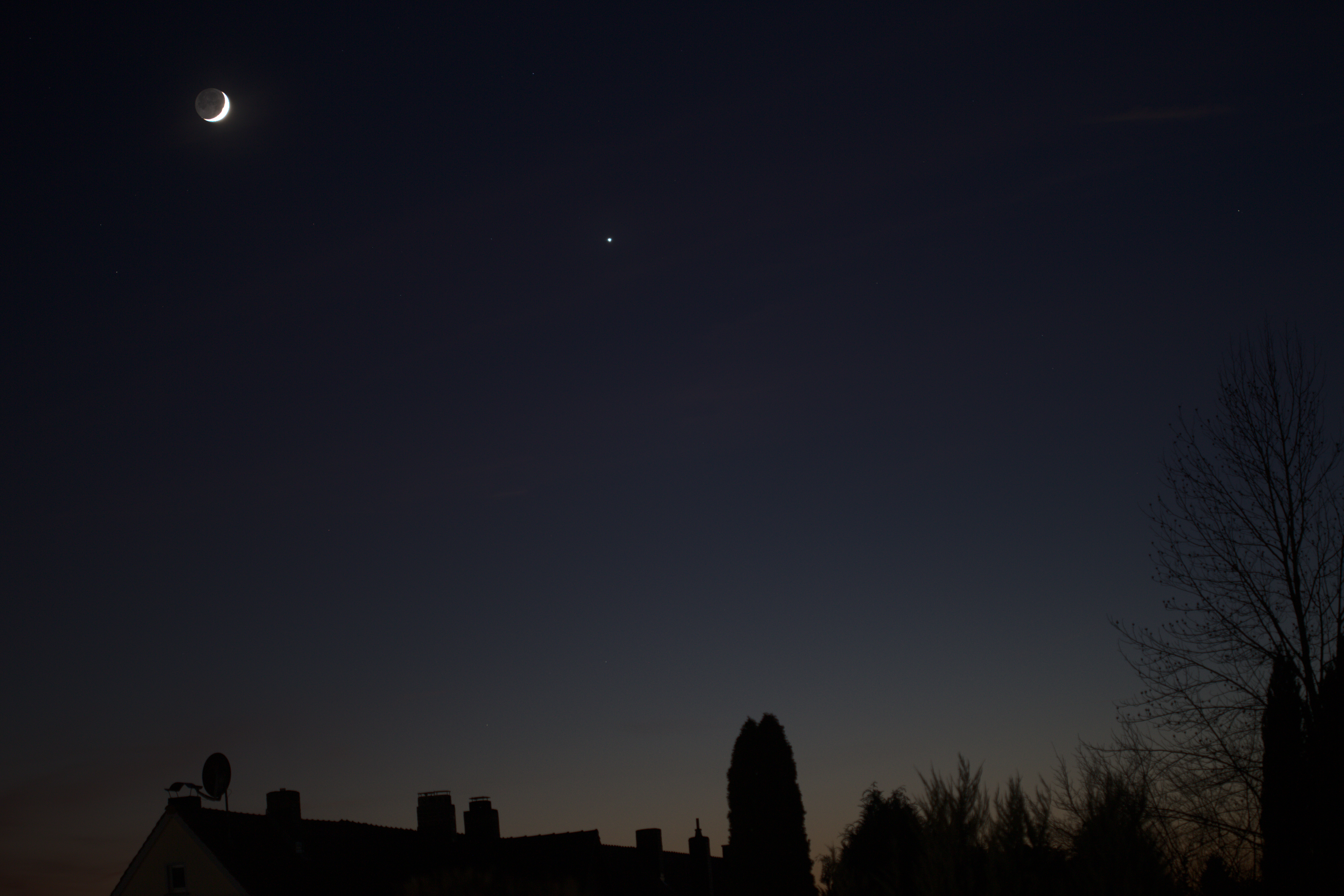 Firstlight bei Nacht: Mondsichel mit Erdlicht und Venus vor der Sil­hou­et­te der Stadt.