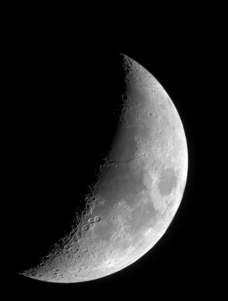 Die Mondsichel wird langsam größer. Ich war gerade noch draußen in der Sternwarte, um die Software am Sternenhimmel einzustellen und zu tunen. Alles funktioniert noch nicht so, wie ich will, aber das wird schon noch werden.