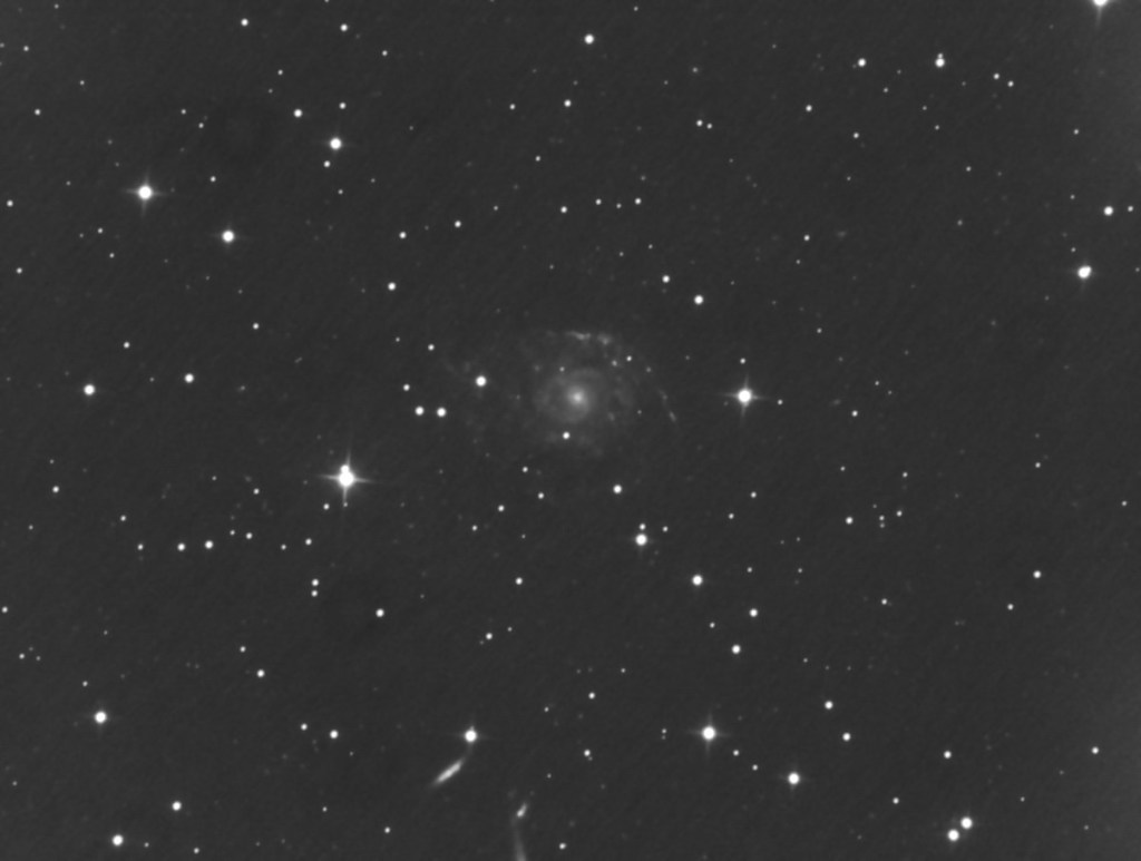Als ich den Pferdekopfnebel im Kasten hatte, kamen Wolken auf. Ich suchte auf die Schnelle ein weiteres Objekt zum Fotografieren. NGC 2805 könnte noch klappen, wenn ich schnell genug war. Die Ausrichtung des Teleskops auf die Spiralgalaxie war kein Problem, die Aufnahme schon. Es zogen erste Wolkenfetzen durchs Bildfeld. Egal, ich zog die Aufnahmen durch, 10 Stück, jede 2 Minuten belichtet.