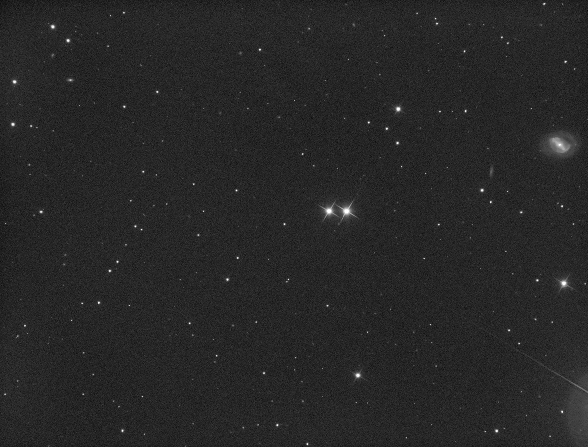 Der Doppelstern in der Mitte des Bildes ist M40. Die interessant aussehende Galaxie rechts oben ist NGC4290 und der helle große Fleck an der Bildecke rechts unten ist das Licht, das von 70 UMa hereinstahlt.