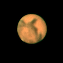 Ich mich heute Abend nochmal hingesetzt und einen Mars produziert, der ein wenig mehr nach Mars aussieht. Die durch das miserable Seeing fehlenden Details auf dem Planeten konnte ich mit der Neubearbeitung auch nicht herzaubern. Ich habe aber versucht, die Farbgebung natürlicher zu gestalten und vorhandene Artefakte zu entschärfen.