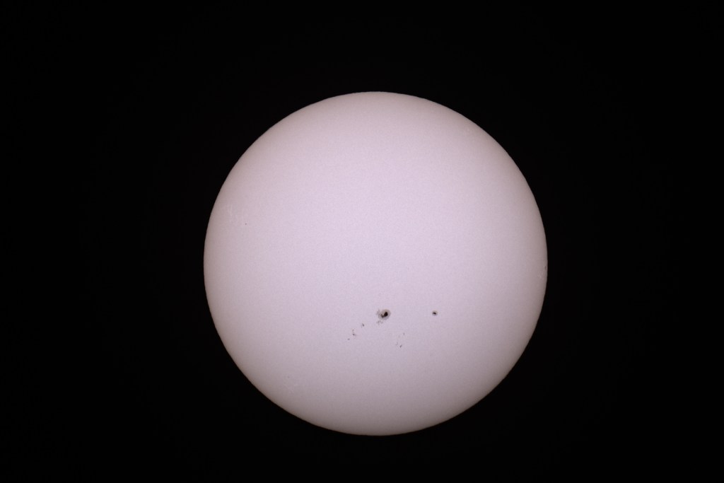 Die Eruptionen kann ich mit meinem Equipement leider nicht fotographisch festhalten. Die Sonnenflecken aber schon. Hier ein Übersichtsbild der Sonne, aufgenommen mit der Canon 6D am Mak mit 1,5m Brennweite. Vorne am Teleskop natürlich eine fotografische Sonnenfilterfolie.