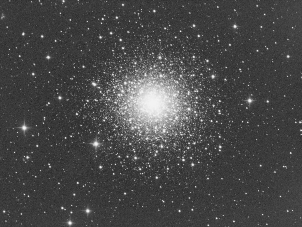 M 92 ist ein sehr schöner und heller Kugelsternhaufen im Sternbild Herkules. Hier eine Schwarz-Weiß-Version, aufgenommen mit 2 Meter Brennweite:
