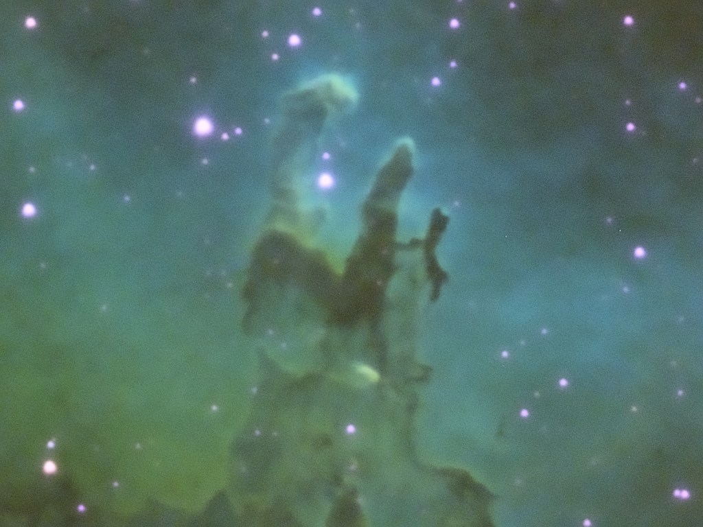 Das ist mein erster Versuch mit Schmalbandfiltern. Leider hat das Mondlicht und aufziehende Wolken nur je ein Foto der drei Kanäle Ha, S2 und O3 zugelassen. Brennweite waren zwei Meter, Belichtungszeit jeweils 10 Minuten.