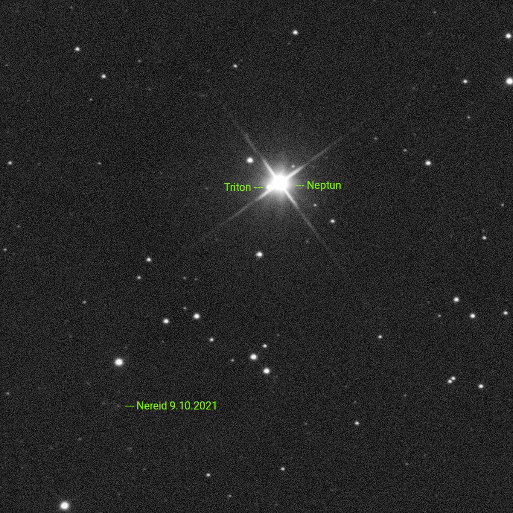 Nereid wurde erst im Jahr 1949 von Herrn Kuiper auf fotografischen Platten entdeckt, die mit einem 82 Zoll Teleskop erstellt wurden. Zum Vergleich: Mein Teleskop, mit dem ich hier aufgenommen habe, hat eine Öffnung von gerade einmal 10 Zoll.