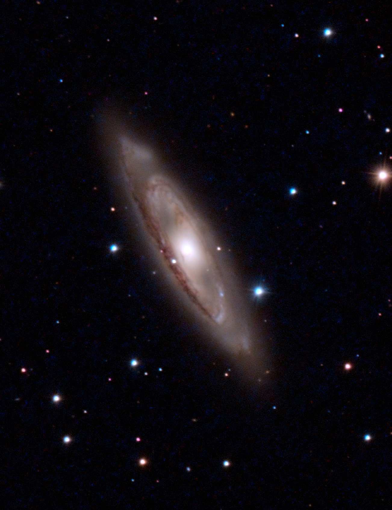 M65 ist eine Spiralgalaxie im Sternbild Löwe. Sie gehört einer eng stehenden Gruppe von drei Galaxien an, die als Leo Triplet bezeichnet werden. Es wird vermutet, daß sich diese drei Galaxien gegenseitig beeinflusst haben könnten. Die beiden anderen Galaxien im Leo Triplet heißen übrigens M66 und NGC3628.