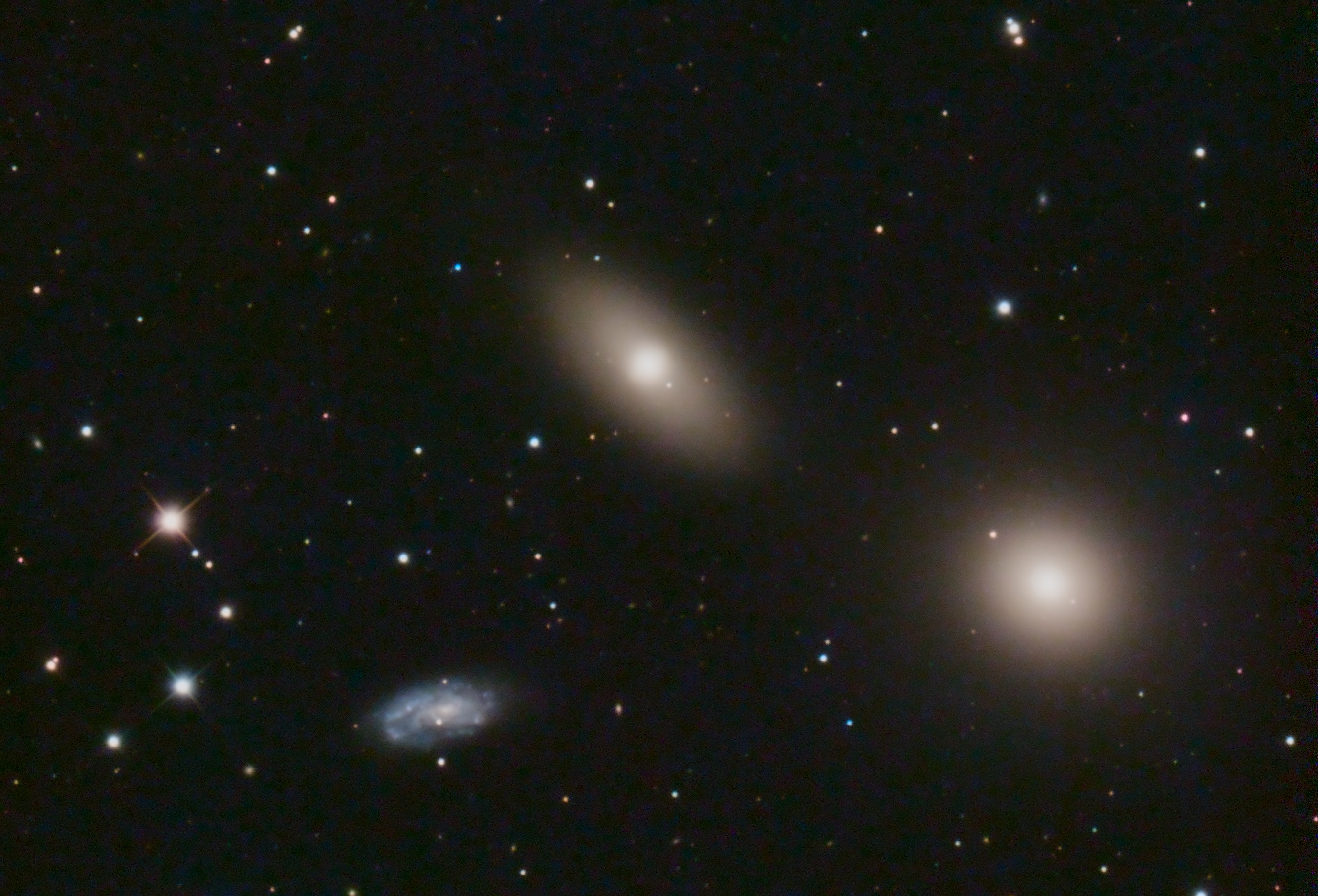 Die Spiralgalaxie links heißt NGC 3389 und befindet sich mit einer Entfernung von 80 Millionen Lichtjahren weit hinter den beiden anderen Galaxien. Ihre Helligkeit beträgt nur 12,8 Magnituden.