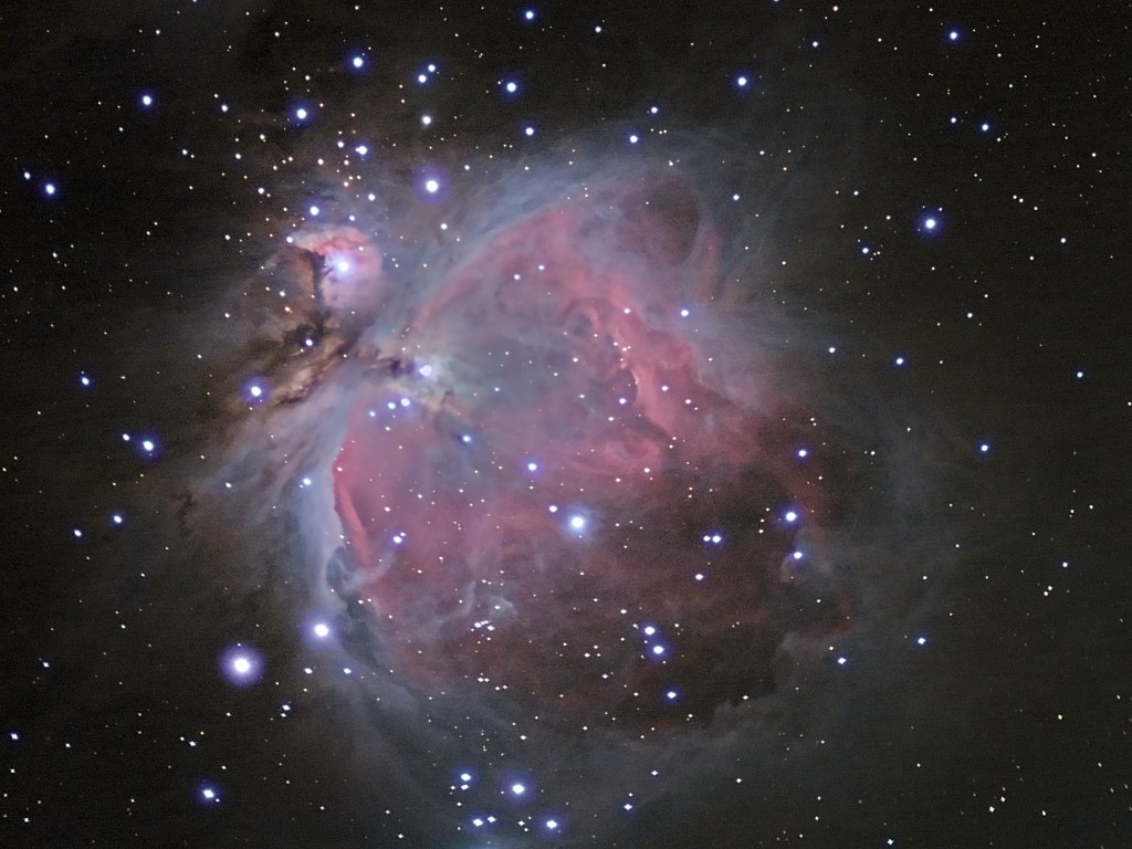 Es gibt ein bißchen was zu erzählen über diesen nur 1350 Lichtjahre entfernten Nebel. Das behalte ich mir aber späteren Blogeinträgen vor. Drum hier nur das Bild des Orionnebels, ein Stack aus 100 Aufnahmen mit je 30 Sekunden Belichtungszeit, bearbeitet mit PixInsight und darktable: