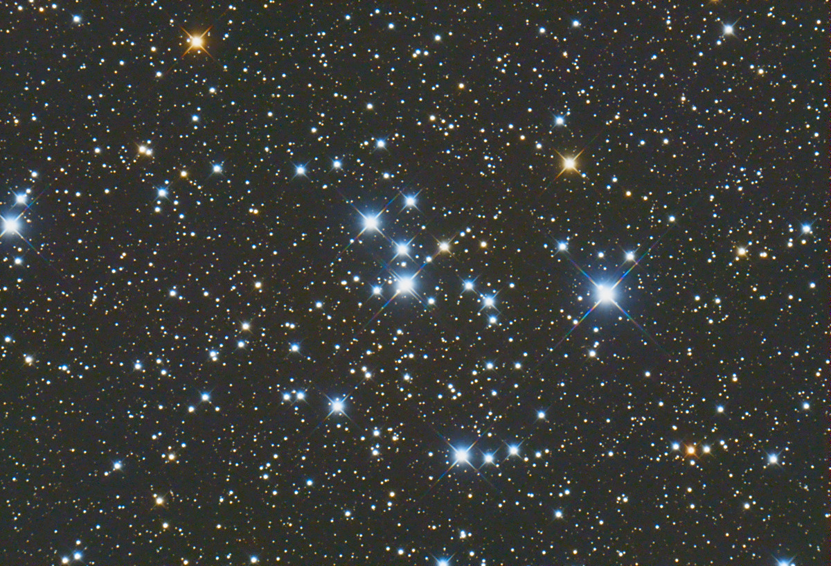 Diese wenigen Sterne haben es aber in sich. Blaue heiße Hauptreihensterne und ein paar orangefarbene Riesensterne sorgen in dem Sternhaufen für einen wunderbaren Kontrast. Die visuelle Helligkeit beträgt nach Stellarium 4,4 Magnituden, die Entfernung zu uns 1.600 Lichtjahre.