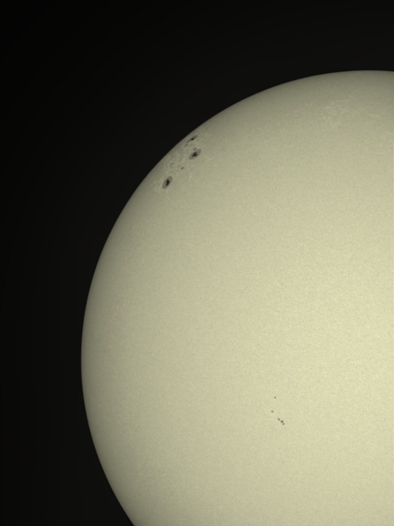 ich hab mit der Astrokamera ASI294MC pro ein kurzes Video im Weißlicht aufgenommen (100 Frames). Diese Bilder hab ich mit autostakkert gestapelt und mit darktable bearbeitet. Die leichte Gelbfärbung stammt von mir, da mir das Bild so besser gefällt.