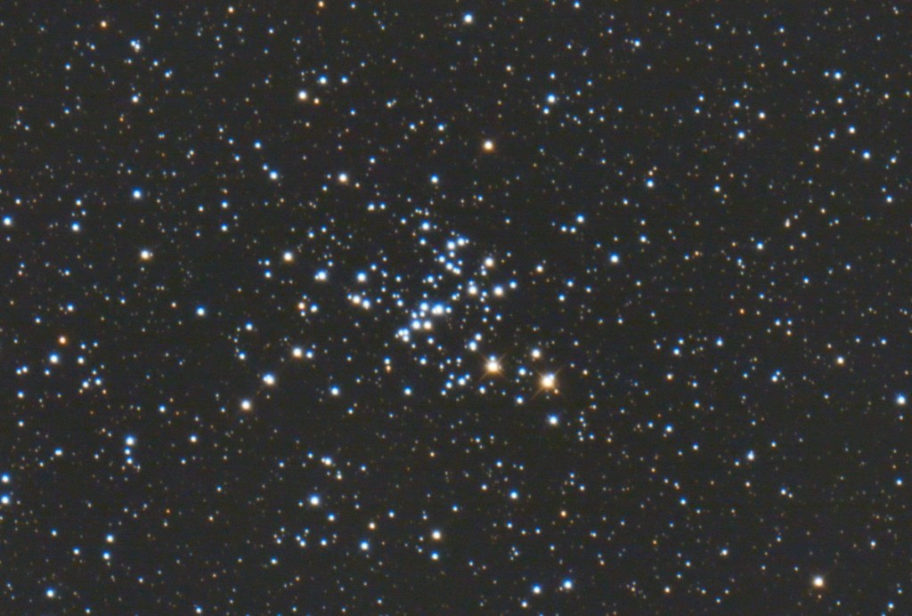 Im Sternbild Achterdeck des Schiffs, etwas oberhalb des markanten Schwanzes des Großen Hundes, findet man diesen offenen Sternhaufen.
