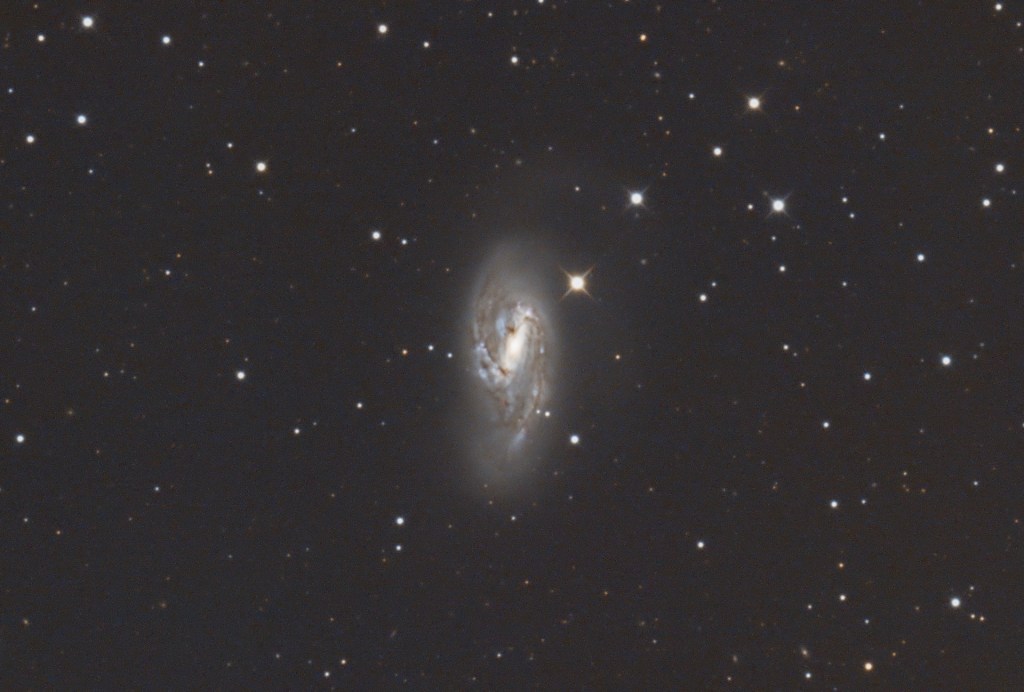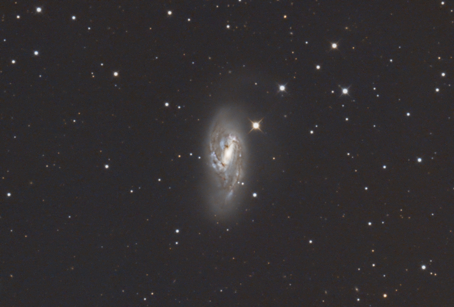 M66 ist eine mit 8,9 Magnituden durchaus helle Spiralgalaxie im Sternbild Löwe. Die Galaxie ist Teil des sogenannten Leo-Triplet, einer Gruppe von drei Galaxien, die sich gegenseitig beeinflussen. Die beiden anderen zum Leo-Triplet gehörenden Galaxien sind M65 und NGC3628. M66 ist die größte dieser drei Galaxien. Obwohl Chef im Ring, sieht man Messier 66 die gravitative Beeinflussung deutlich an.