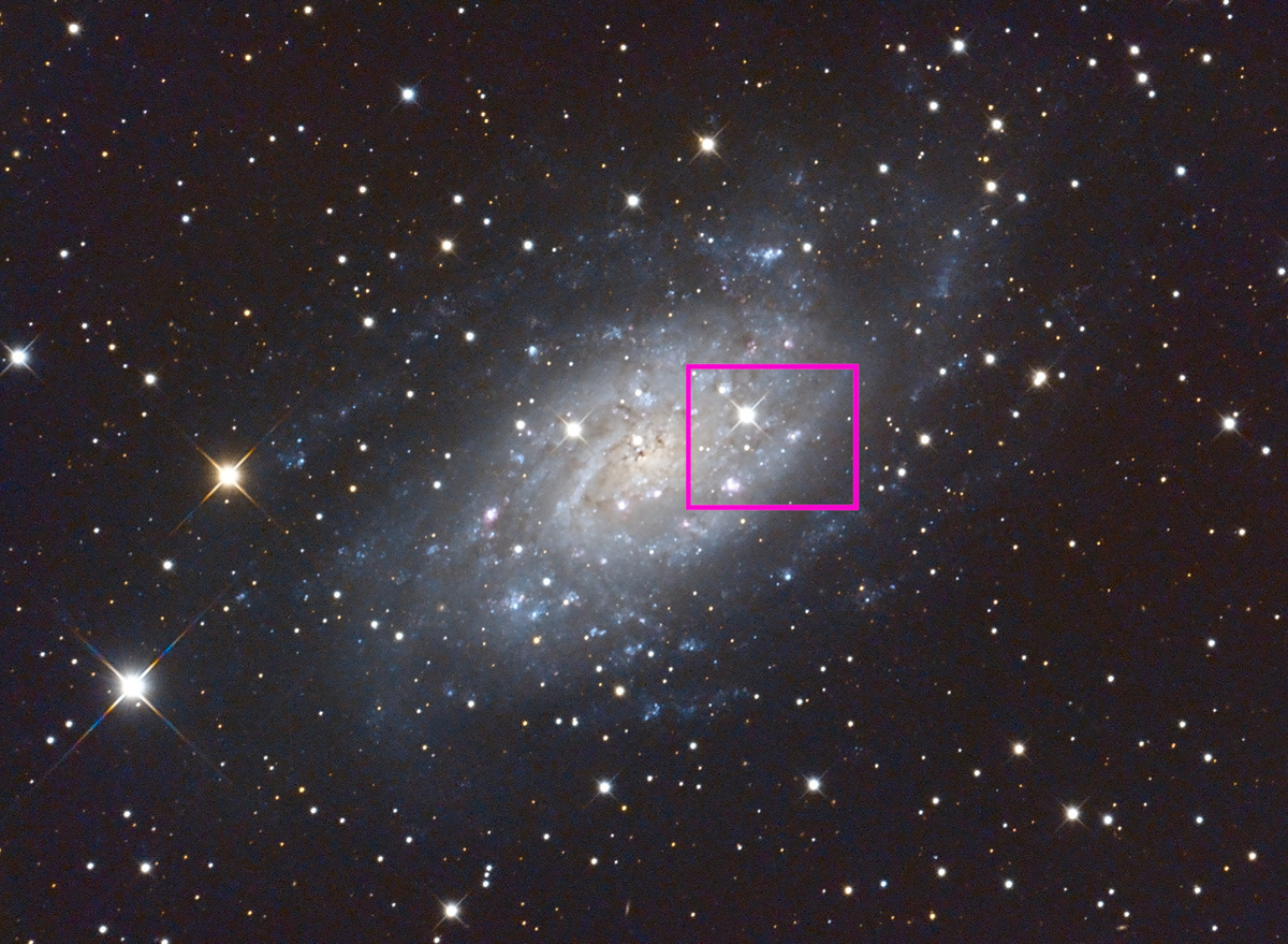 In dieser Galaxie findet eine rege Sternentstehung statt und große kurzlebige Sterne sind bereits als Supernova explodiert. Eine besonders auffällige Supernova wurde 2004 entdeckt. Zoomen wir einmal ins Bild rein und schauen, ob wir von der Supernova noch etwas entdecken können.