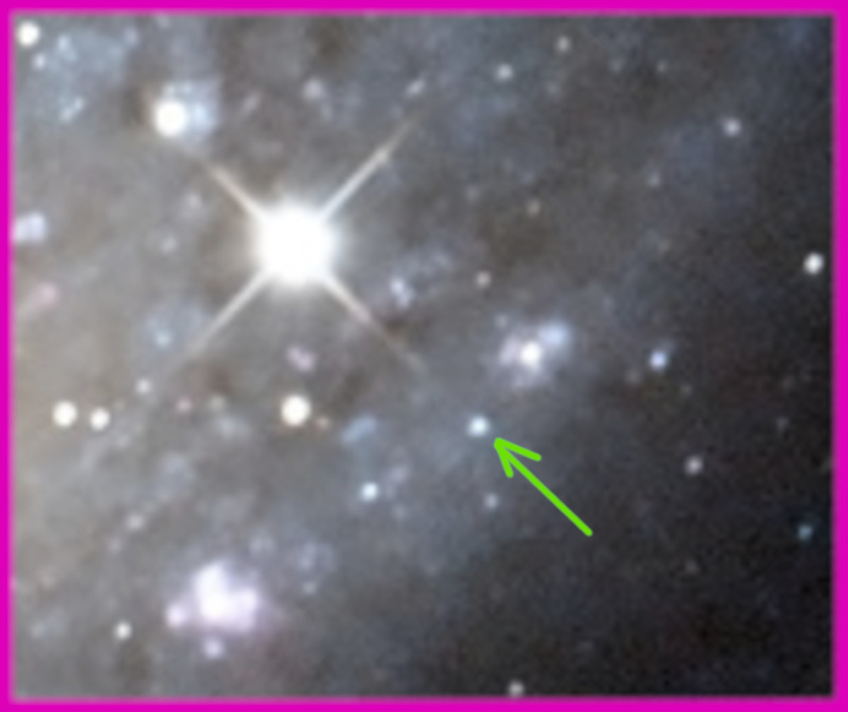 Ich hab einen Pfeil ins Bild gemalt. Hier müßte sich eigentlich ein offener Sternhaufen befinden. Die Helligkeit des Objektes passt aber ganz und gar nicht zu der des Sternhaufens. Deshalb denke ich, daß es sich um den Überrest der Supernova von 2004 handelt.