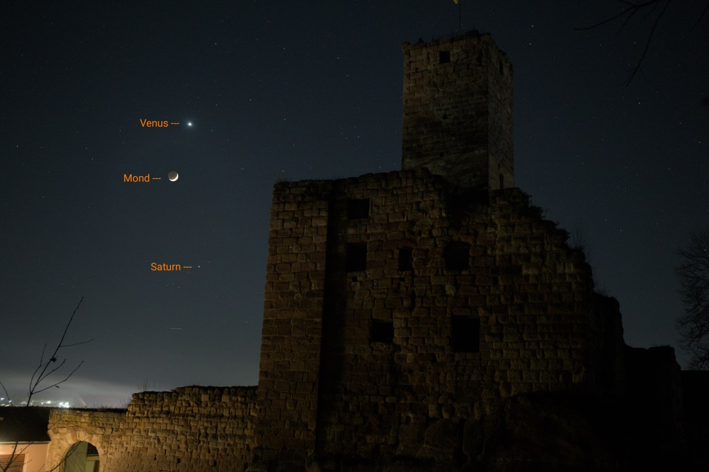 Gestern Abend gab es eine nicht ganz alltägliche Konstellation am Himmel. Venus und Saturn waren zu sehen. Und zwischen den beiden Planeten zeigte sich ein schöner Sichelmond, dessen unbeleuchteter Teil zudem noch im Erdlicht sichtbar wurde.