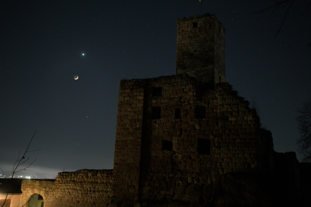 Der Schlittenberg wird, seit ich denken kann, Schlossbug genannt. Das Gemäuer, das hier steht ist aber kein Schloss, sondern eine Burgruine. Und mit dieser Burg als Kulisse wollte ich die Planeten – Mond Konstellation aufnehmen.