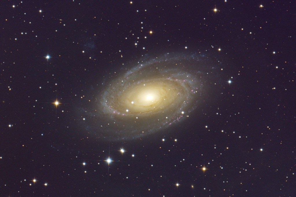 Messier 81, die größere der beiden Galaxien hat den Zusammenstoß anscheinend besser weggesteckt, denn sie ist als schöne Spiralgalaxie zu erkennen, genauso weit weg wie M82 und 7 Magnituden hell.
