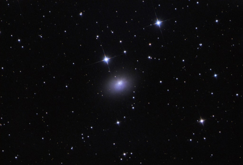 Der Durchmesser von NGC3077 beträgt etwa 20.000 Lichtjahre. Sie ist vor 100 Millionen Jahren Bodes Galaxie etwas näher auf den Pelz gerückt, was zu einem Wasserstoffband zwischen den beiden Galaxien führte. Seit dem entstehen dort reichlich neue Sterne.