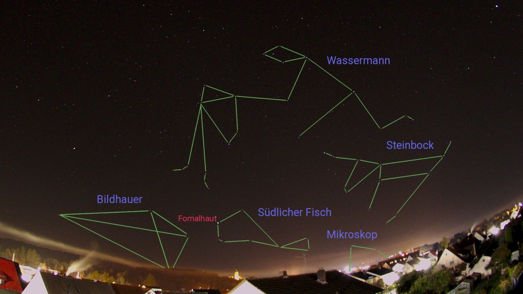 Fomalhaut, der helle Stern im Südlichen Fisch kann sich selbst so nahe am Horizont noch durch den Dunst durchsetzen. Gleich daneben liegt das Sternbild Bildhauer.