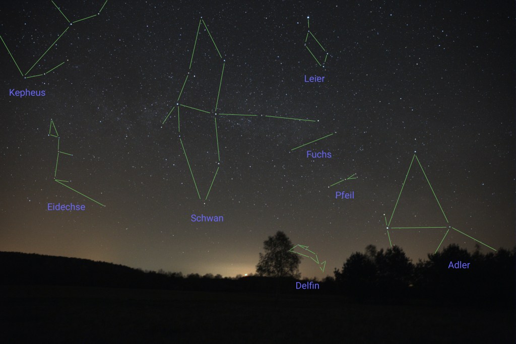 Gleich unterhalb des Schwanenkopf. am besten nach der Reihenfolge der Sternbilder richten: Schwan, Fuchs, Delfin, Adler