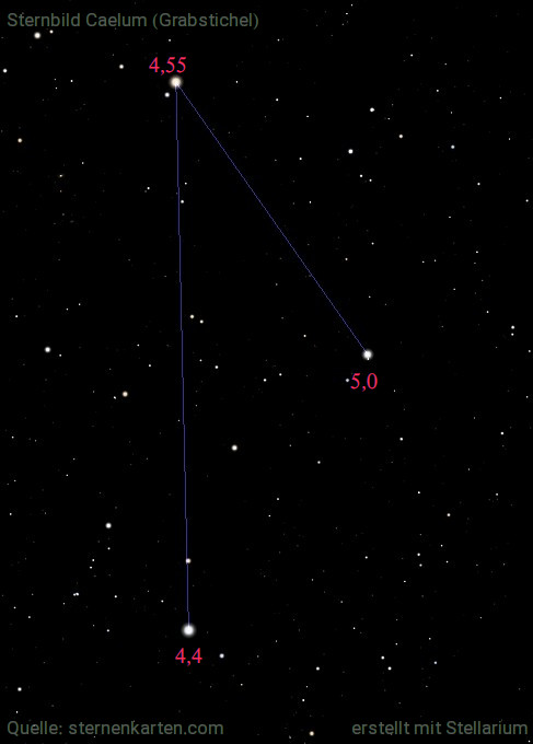 Als Orientierungshilfe mag das Sternbild Orion dienen. Einfach die Schwertscheide, die am Gürtel des Jägers hängt nach unten verlängern. Dann kommt zuerst das Sternbild Hase und dann ganz unten am Horizont die Taube und der Grabstichel.