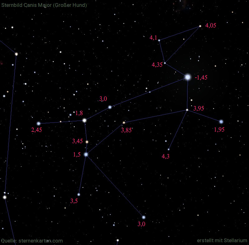 Wenn der Große Hund am Himmel ist, ist er leicht zu finden. Wie gesagt, grob Südrichtung und dann nach dem hellsten Stern in dieser Gegend schauen. Das ist dann Sirius, der Hundsstern. Den kann man gar nicht übersehen, denn Sirius ist der mit Abstand hellste aller Sterne am Nachthimmel.