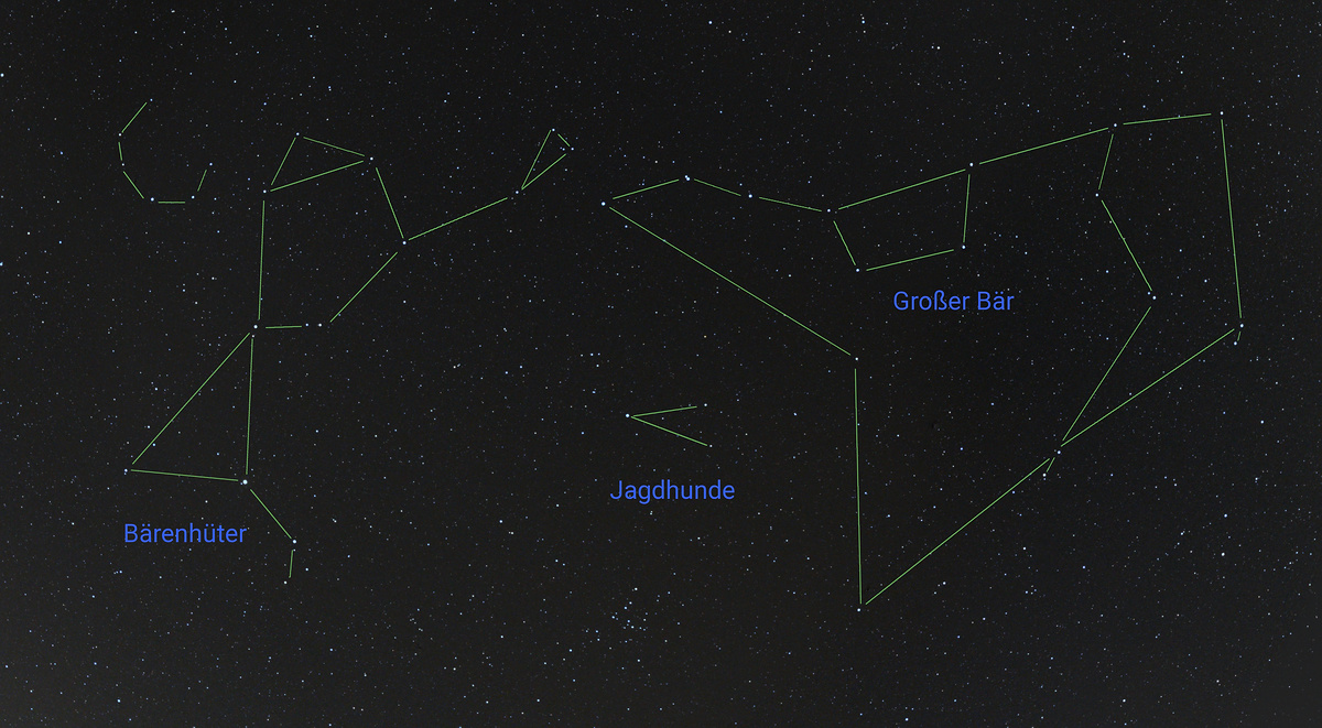 Das Sternbild Jagdhunde befindet sich zwischen dem Bärenhüter und dem Großen Bären. Einfach von der Schnauze des Großen Bären nach unten gehen. Man könnte auch sagen: Vom Griff es Großen Wagens nach unten.