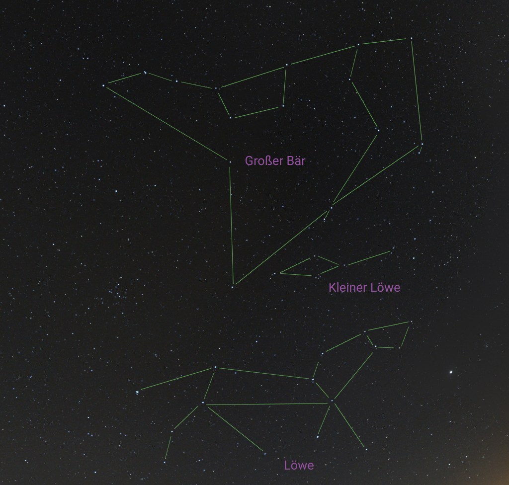 Das Sternbild Kleiner Löwe liegt zu Füßen des Großen Bären, also zwischen Großer Bär und Löwe.
