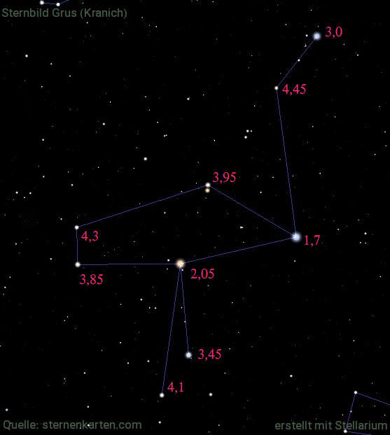 Sollte es jemand dennoch ausprobieren wollen, diesen Stern mit dem Auge zu erhaschen, dann kann als Orientierungspunkt der Stern Fomalhaut im Sternbild südlicher Fisch gelten. Der Südliche Fisch steigt zwar auch nicht sehr hoch über den Horizont, Fomalhaut kann sich aber dank seiner 1,15 Magnituden ganz gut gegen den Dunst behaupten. Hat man Fomalhaut, kann man sich den Rest des Südichen Fisches ausmalen. Unterhalb der Schwanzflosse des Fisches schielt der Kranich über schüchtern über den Horizont.