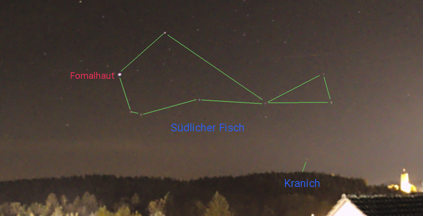 Sollte es jemand dennoch ausprobieren wollen, diesen Stern mit dem Auge zu erhaschen, dann kann als Orientierungspunkt der Stern Fomalhaut im Sternbild südlicher Fisch gelten. Der Südliche Fisch steigt zwar auch nicht sehr hoch über den Horizont, Fomalhaut kann sich aber dank seiner 1,15 Magnituden ganz gut gegen den Dunst behaupten. Hat man Fomalhaut, kann man sich den Rest des Südichen Fisches ausmalen. Unterhalb der Schwanzflosse des Fisches schielt der Kranich über schüchtern über den Horizont.