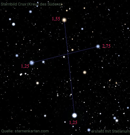 Es ist ein kleines aber sehr markantes Sternbild. Vier helle Sterne markieren das Kreuz am Nachthimmel. Als Orientierungspunkt mögen die Sterne Alpha Centauri und Beta Centauri im Sternbild Zentaur dienen.