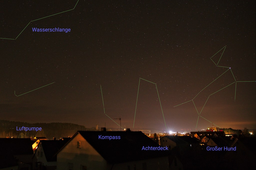 Das Wie ist gar nicht so einfach, denn die Luftpumpe ist ein sehr dunkles Sternbild, das zudem in Mittelfranken nicht sehr weit über den Horizont steigt. Mit einem Fernglas hat man vielleicht eine Chance.