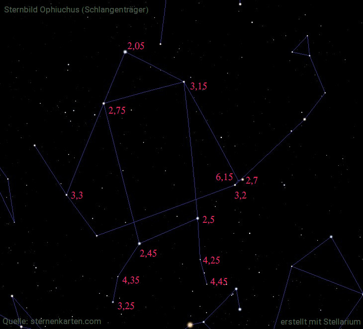 Obwohl der Schlangenträger einige helle Sterne enthält, tue ich mich dennoch hart, das Sternbild zu identifizieren. Um es leichter erkennen zu können, habe ich Äskulap eine dreieckige Zipfelmütze aufgesetzt.